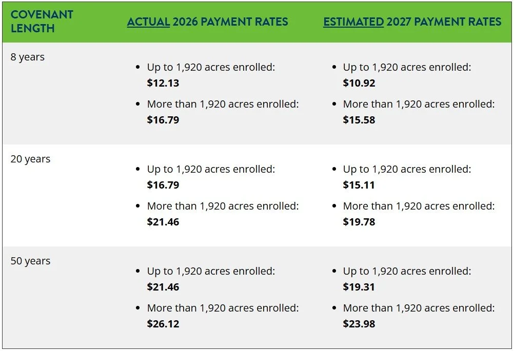 Example: You have a 20-year covenant on your property. You may request termination at year 10 and must remain in the program until year 20, you will then be released from the program. If you wait until year 20 to request termination, you will need to fulfill another half of the covenant length (10 years) before termination is granted.